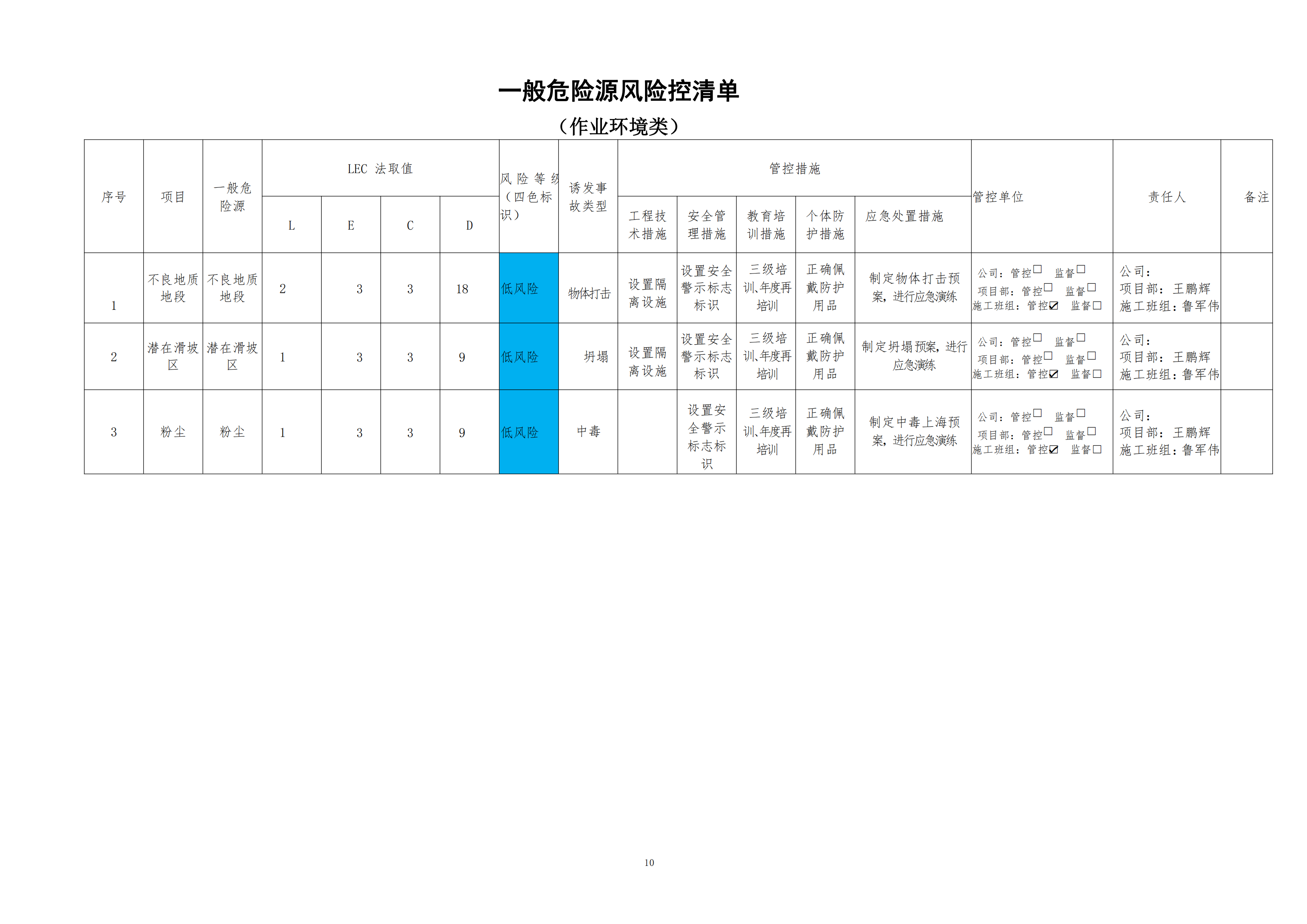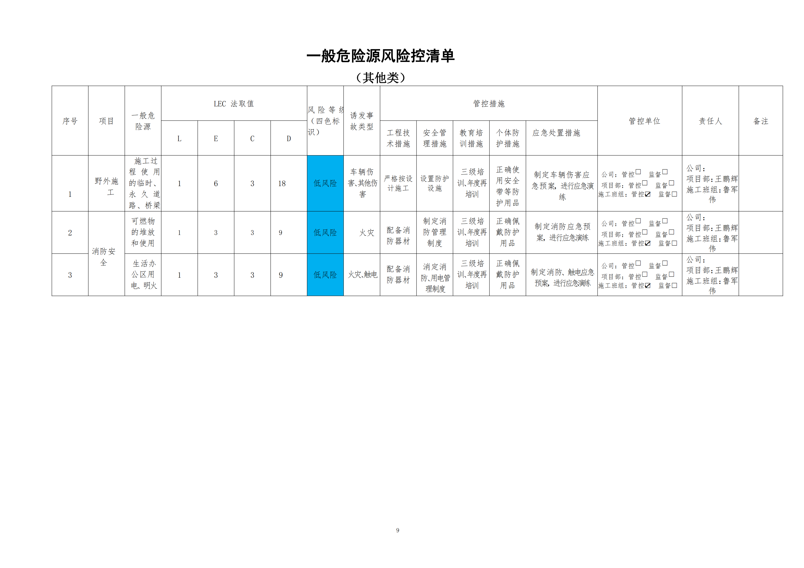 欒川縣新建水庫一期工程施工一標段危險源風險分級管控清單(9月)